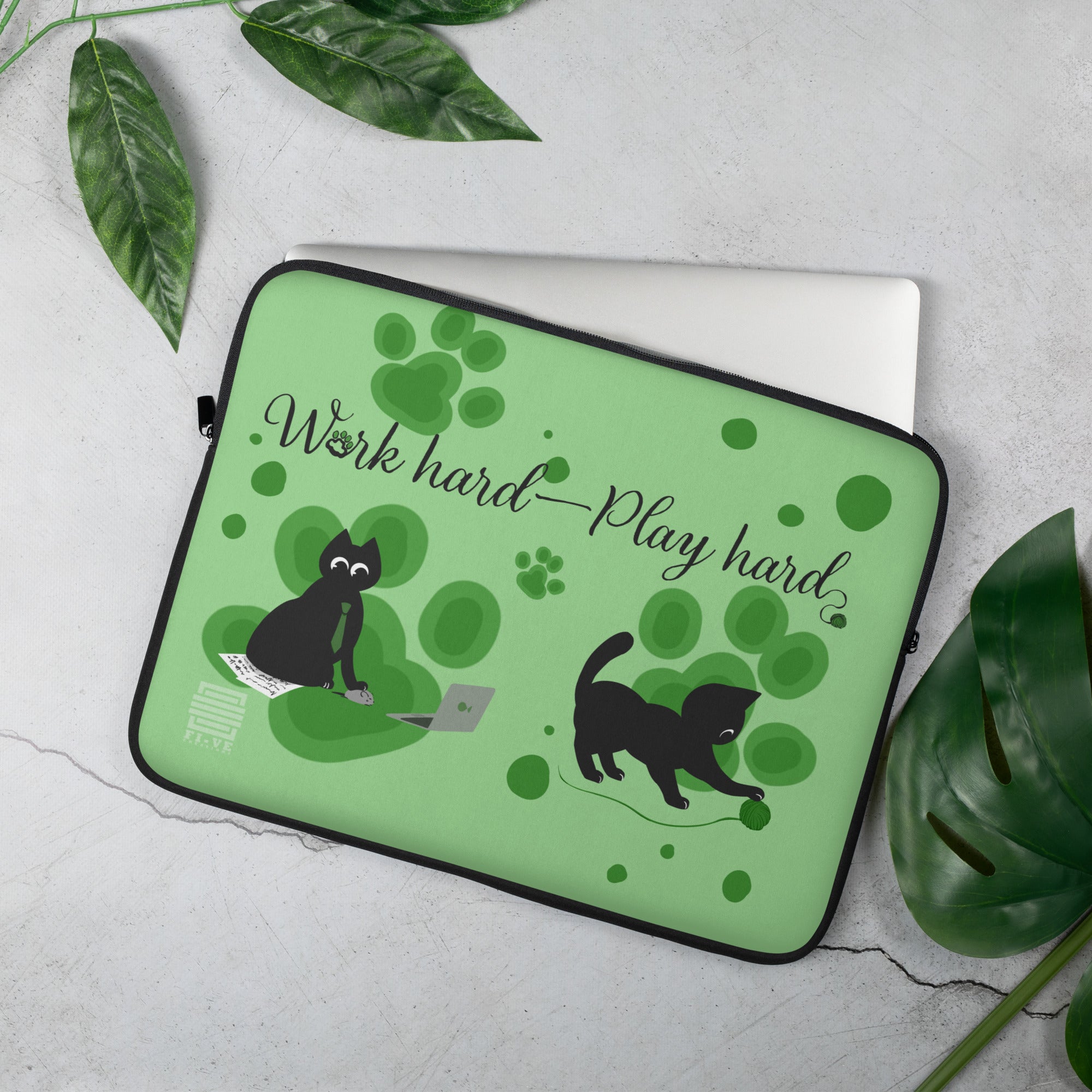 Laptoptasche grün „Work hard – Play hard“ mit verspieltem Katzenmotiv – Stilvoller Schutz für unterwegs